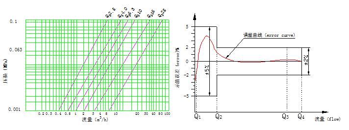 外形尺寸 OVERALL DIMENSIONS 壓力損失曲線 Pressure loss curve 示值誤差限與流量曲線FLOW-ERROR