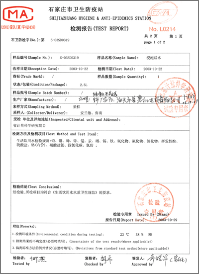 檢驗(yàn)報(bào)告 “石家莊衛(wèi)生防疫站浸泡前水”