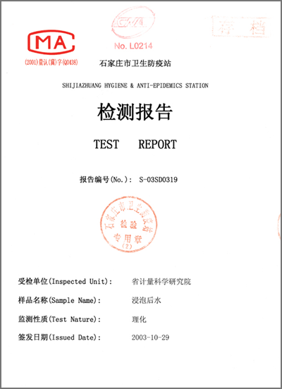檢驗(yàn)報(bào)告 “石家莊衛(wèi)生防疫站浸泡后水”