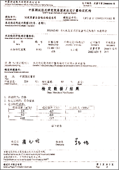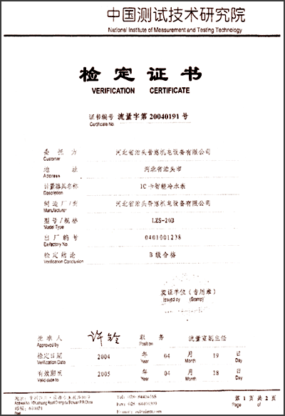 中國測試機術(shù)研究院檢定證書“IC卡智能冷水表 20040191號”