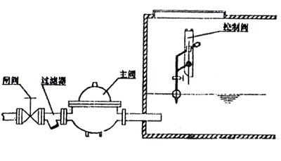 KYF型浮球式液壓水位控制閥安裝使用維護(hù)說明1.液壓水位控制閥公稱壓力分1.0Mpa、1.6Mpa兩等級(jí)。 2.主閥與導(dǎo)閥可組合安裝與分離安裝。100X以分離安裝為宜,當(dāng)主閥與導(dǎo)閥分離安裝時(shí),所配管用戶自選。 3.為防止主閥內(nèi)堵,閥前應(yīng)加裝過濾器。 4.為安裝與維修方便。在主閥或控制導(dǎo)閥頂部應(yīng)留足夠大的入孔。 5.吊球式液壓水位控制閥,液面高度可調(diào),調(diào)整時(shí)改變球上方卡箍位置即可達(dá)到目的。 6.吊球式液壓水位控制閥,聯(lián)桿端部固定螺絲緊固要牢靠,防止松動(dòng),以免動(dòng)作失靈,并定期檢查。 7.重錘位置可調(diào),球升卡箍位置,球應(yīng)隨波面同時(shí)上升,不然,調(diào)整重錘位置加大力臂長(zhǎng)度即可。 8.主閥不過水時(shí),檢查小導(dǎo)閥是否堵塞,當(dāng)達(dá)到設(shè)定液面繼續(xù)供水時(shí),檢查導(dǎo)閥內(nèi)是否有臟物卡在閥瓣與閥芯之間。 9.液壓水位閥前是否設(shè)止回閥?液壓水位閥下游要安裝手動(dòng)閘閥或碟閥,起到硬關(guān)閉的作用;如果液壓水位閥為了壓力或其它考慮進(jìn)水口安到水位以下的,要考慮安裝止回閥,防止水回流。 KYF型浮球式液壓水位控制閥安裝示意圖A. KYF型主閥體與控制導(dǎo)閥結(jié)合式安裝  |